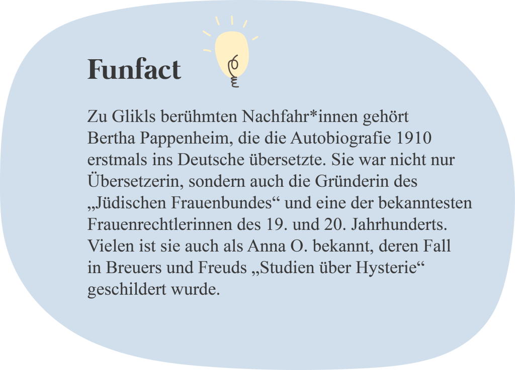Was vielleicht heute als gewöhnliche Tat erscheinen mag, war zu jener Zeit Pionierleistung. Frauen verfassten damals keine Autobiografien. Zwar existierte die Praxis bereits seit 200 Jahren, aber sie lag ausschließlich in männlicher Hand. Glikl war die erste deutschstammige Frau, die Memoiren schrieb.